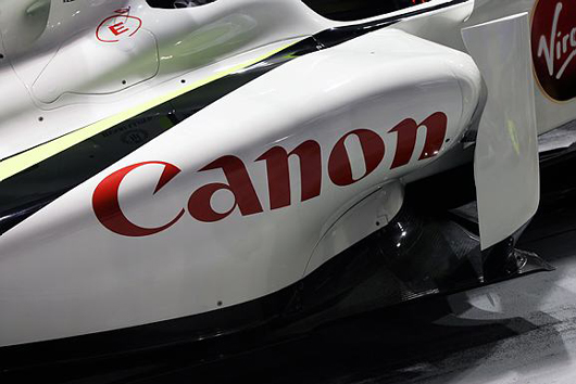 シンガポールに持ち込まれたブラウンGPのマシンBGP001のサイドポッドには、キヤノンのロゴが大きく掲載されている。シンプルなカラーリングのブラウンGPのマシンに赤のCanonの文字が映えている。